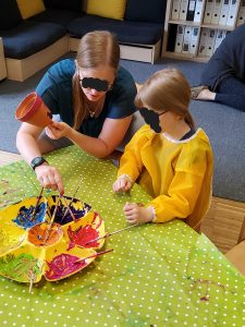 In der Wolkengruppe wurde der Hörsinn angesprochen. Es wurde verschiedene Klanginstrumente ausprobiert und dann ihr Geräusch in einem Spiel erraten.