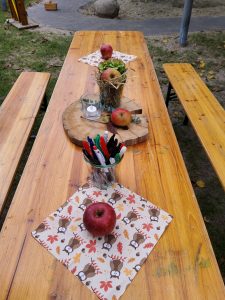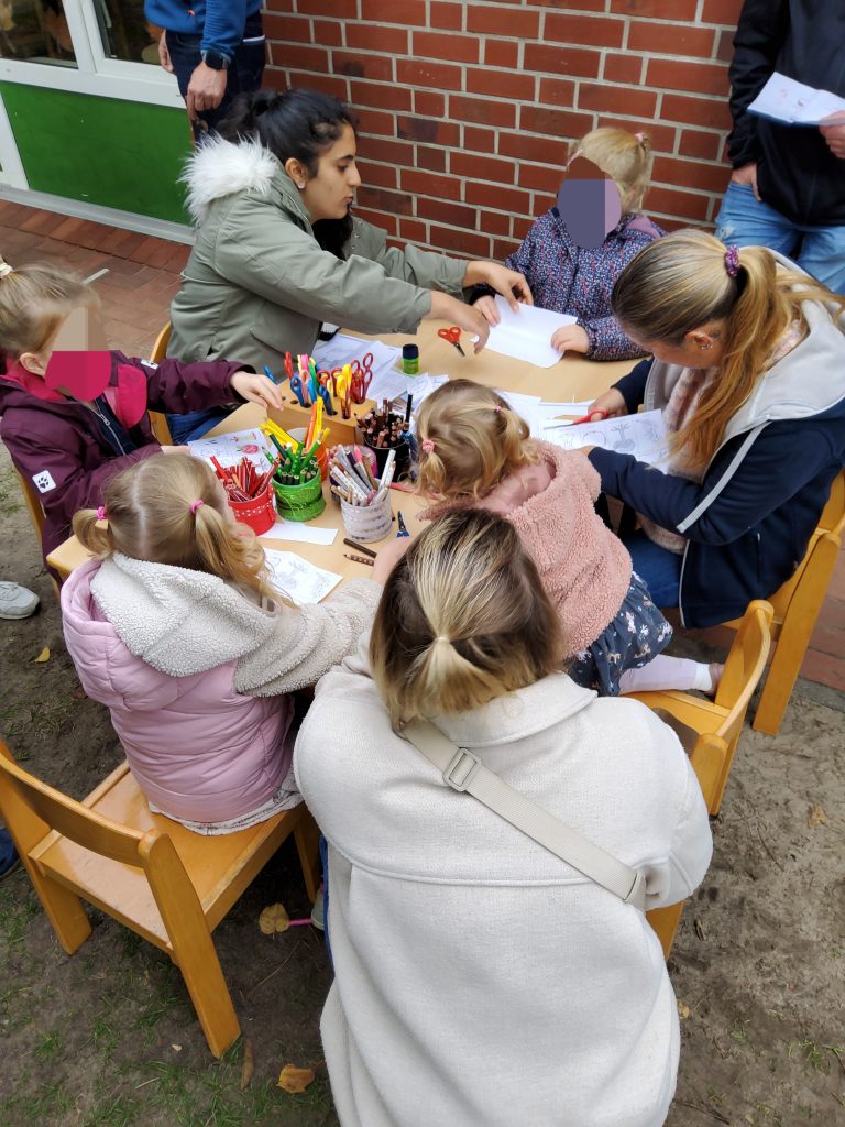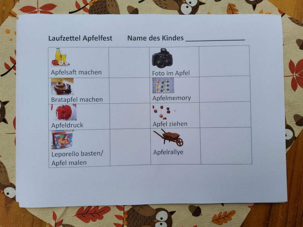 In diesem Jahr haben wir ein Apfelfest gefeiert. Es haben Familien teilgenommen und wir hatten großen Spaß. Die Kinder konnten sich einen Laufzettel nehmen, um alle Stationen zu besuchen, die Angebote dort zu genießen.